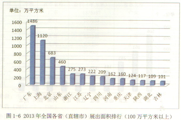 根據(jù)中國貿(mào)促會發(fā)布的《中國展覽經(jīng)濟(jì)報(bào)發(fā)展告(2013)》。展會數(shù)量方面,按?。ㄗ灾螀^(qū)、直轄市)分析,2013年 全國展覽活動(dòng)按數(shù)量排列,前世的一次是:廣東506個(gè),上海361個(gè),北京265個(gè),山東181個(gè),浙江171個(gè),江蘇161個(gè),遼寧92個(gè),河南85個(gè),四川75個(gè),河北66個(gè)。這十個(gè)省(自治區(qū)、直轄市)的展覽總數(shù)量占全國總量的70%集聚了全國主要的展覽活動(dòng)。其中,廣東省展覽會舉辦數(shù)量位居全國第一,展出面積位居全國第一,同時(shí),在場均長出面積排名方面,廣東以2.21萬平方米、場位居全國第一,說明廣東省無論從展覽會整體規(guī)模、發(fā)展水平還是整體質(zhì)量上,都處于全國領(lǐng)先地位。