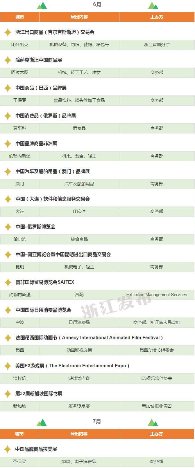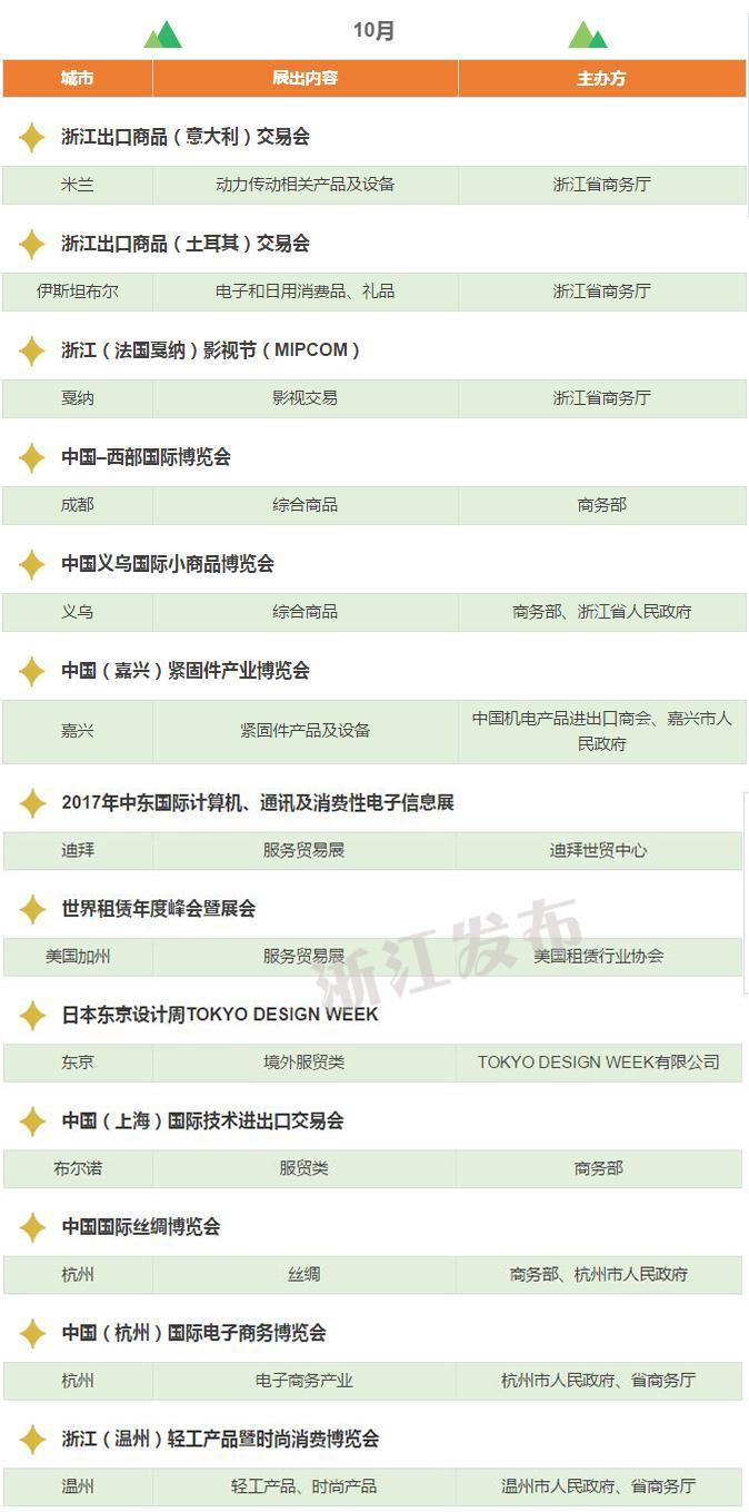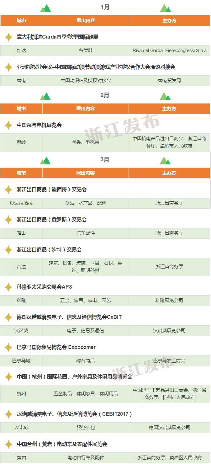 2017年,浙江將重點舉辦和支持96個展會,其中自辦類貨物貿(mào)易展會12個,自辦類服務貿(mào)易展會5個,境外政策性重點展17個,境內(nèi)政策性重點展11個,其他類重點展36個,商貿(mào)流通展會15個!