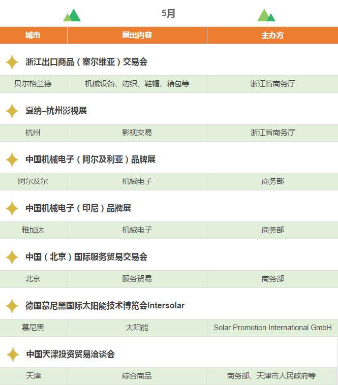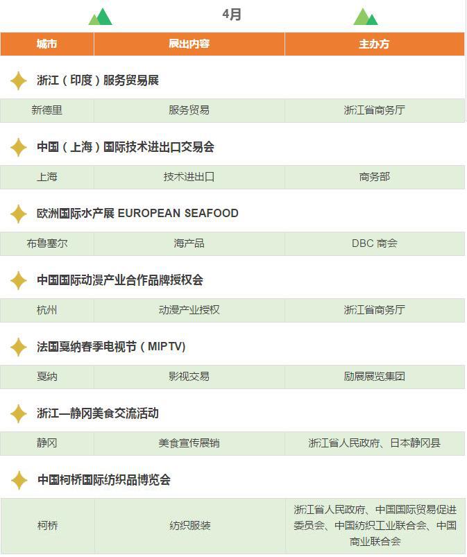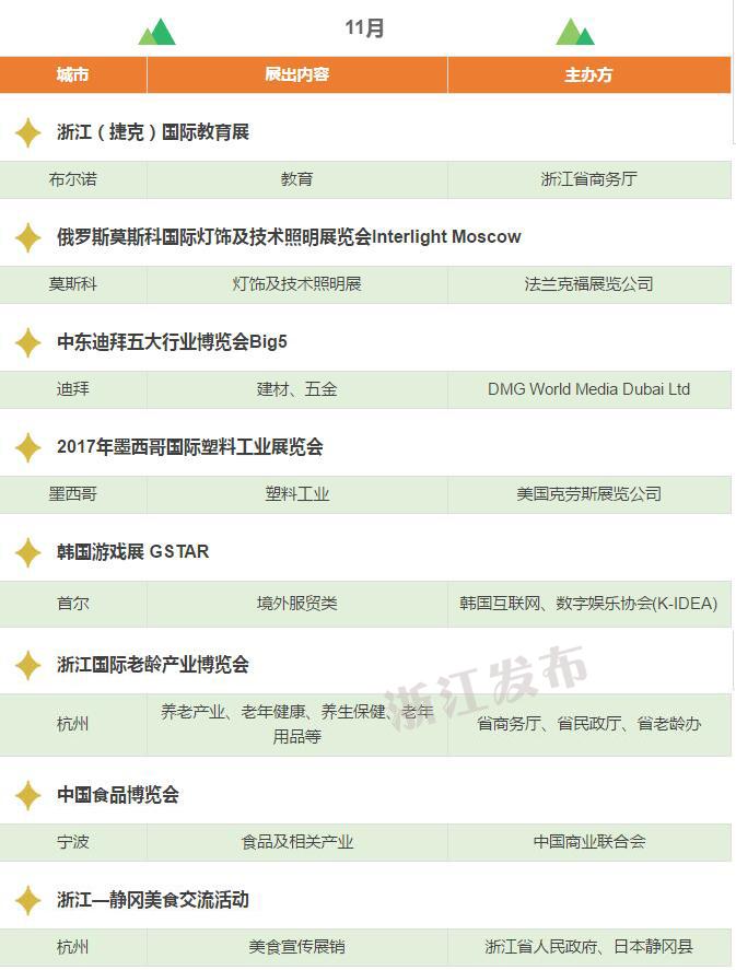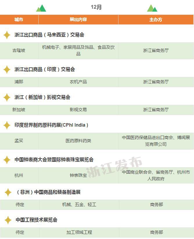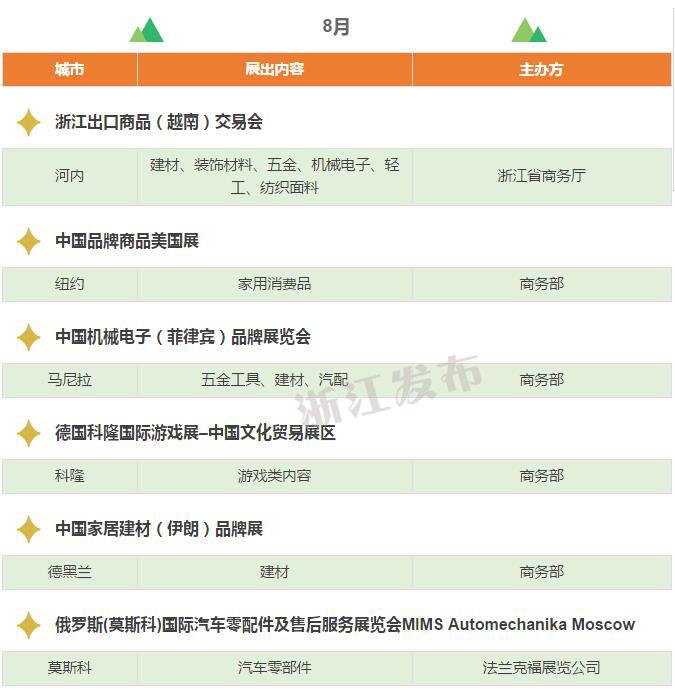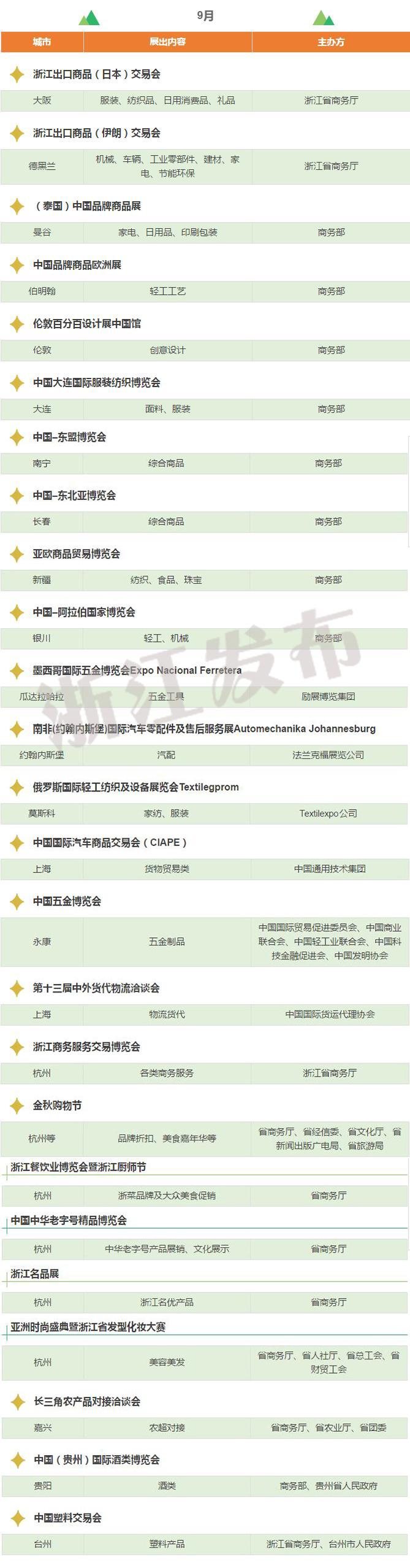 2017年,浙江將重點舉辦和支持96個展會,其中自辦類貨物貿(mào)易展會12個,自辦類服務貿(mào)易展會5個,境外政策性重點展17個,境內(nèi)政策性重點展11個,其他類重點展36個,商貿(mào)流通展會15個!