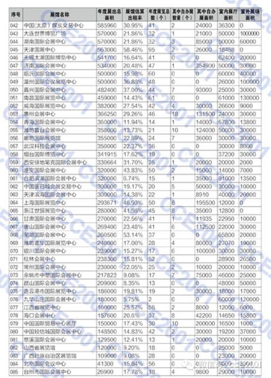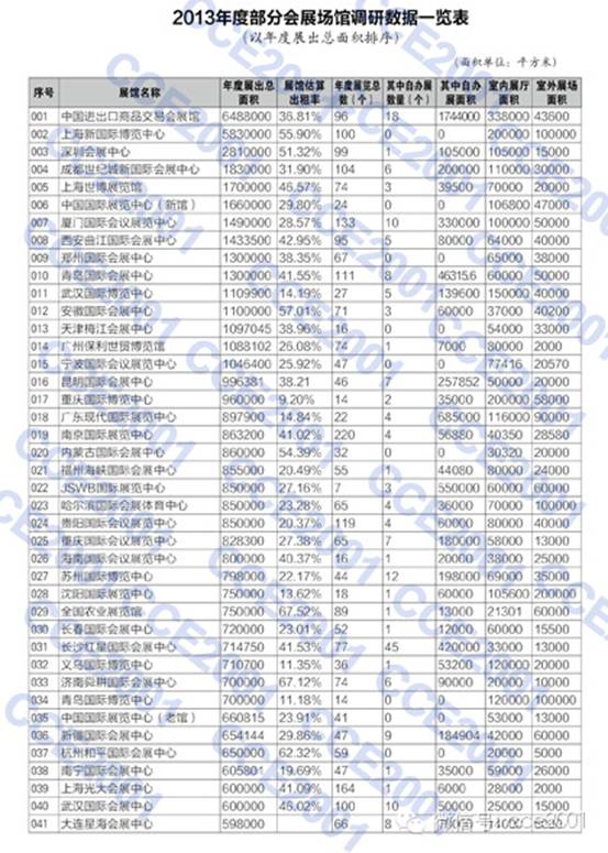 2013年度估算出租率平均值為27.70%,該數(shù)字與2012年的28.99%相比略有下降。?? 此排行榜是按照各展館2013年度展出總面積從大到小的順序刊登出部分?jǐn)?shù)據(jù)。?
