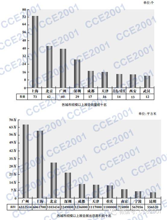 按照總展出面積統(tǒng)計,廣州以655.3萬平方米位居第一,上海以606.2萬平方米位居第二,北京以310.34萬平方米的面積蟬聯(lián)探花,深圳以224.9萬平方米連續(xù)多年成為北上廣三巨擘之后的第四會展城市,成都以123.6萬平方米超過其他快速發(fā)展的省會城市與經(jīng)濟發(fā)達城市,位居第五。