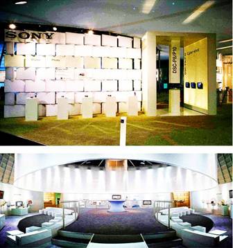 4、道具虛無化風(fēng)格。即將承載展品的柜、臺、架等道具處理為視覺感虛化的效果;或者將展品處理為多媒體展示,而不直接陳列實物。這種充分利用新材 料、新工藝、新煤體、新技術(shù)的創(chuàng)意設(shè)計,既能充分保留和展示展臺的特色造型,又能給觀眾在參觀展品時,對展臺的道具產(chǎn)生新奇和神秘感。道具的“虛化”視覺感和展品的“實化”視覺感所產(chǎn)生強烈的對比,使“虛”與“實”形成視覺交替,給人以時尚趨勢的導(dǎo)向。