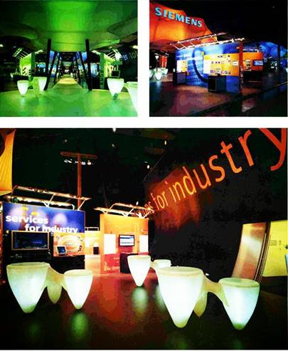 2、形象統(tǒng)一化風(fēng)格。即以參展商CIS戰(zhàn)略形象為統(tǒng)一標(biāo)志,運用于其參加的所有的國際性、區(qū)域性展覽活動的展示設(shè)計中。一些大型品牌企業(yè)都有自身企業(yè)形象的標(biāo)準(zhǔn)化圖形、字體、色彩等要素及其特殊結(jié)構(gòu)的道具等,他們在參加國內(nèi)外的系列展覽活動時,都規(guī)定展示設(shè)計者在其企業(yè)文化形象框架內(nèi)設(shè)計展臺,以突顯該企業(yè)的獨特個性形象。這種統(tǒng)一形象風(fēng)格的展示設(shè)計,能強化觀眾對該企業(yè)文化形象的視覺記憶。