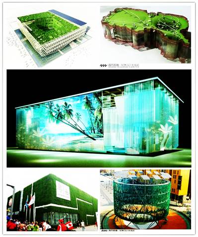 (2)、用作色彩過渡。展示設(shè)計中所展覽的物品大多是一些沒有生命特征的東西,為了達到展示的最佳效果,往往在形式和顏色上大做文章,使得一些地方不夠自然,也造成了色彩和形式的矛盾,感覺顏色刺眼。這個時候融入園林景觀可以做到虛化邊界和緩和展示建筑菱角矛盾的作用,同時由于一些展示場色彩也比較暗淡,融入綠色可以給展覽帶來美好的視覺體驗,刺激觀眾的眼球,從而達到展覽的最佳效果。
