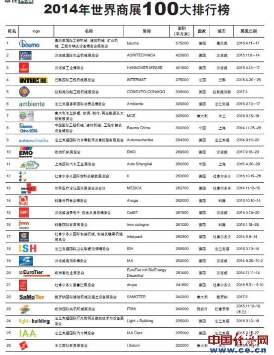5. 世界商展100大排行榜由進出口經(jīng)理人雜志社獨立研究發(fā)布,于2008年首次推出,每年7月發(fā)布,2014年是第7次推出這一榜單。
