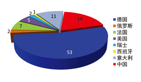 德國作為世界大型商展的主導(dǎo)力量至今無人能撼,但發(fā)展速度略低,在2013年世界商展100大排行榜中,德國展覽超過半數(shù),達到53席。中國比上年再增1席,從18席增加到19席,為鞏固中國在世界展覽中第2大陣營的地位又添一磚。美國也從危機中復(fù)蘇,在100大榜中從4席增加到5席。榜單中其他國家均保持了自己的地位:法國8席、俄羅斯2席,瑞士2席、西班牙1席,見圖1。