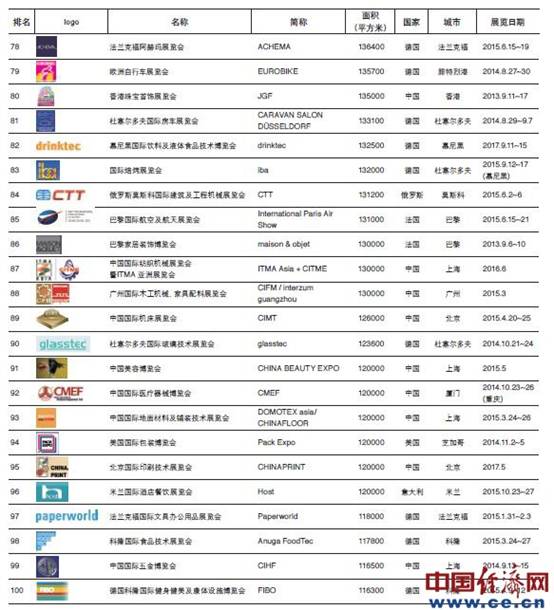 前不久,由《進出口經(jīng)理人》雜志社主辦的2014進出口經(jīng)理人年會暨中國外貿(mào)市場報告發(fā)布會在京舉行。會上發(fā)布了2014年世界商展100大排行榜,榜單顯示,100大中的中國展覽平均面積均低于平均面積,但發(fā)展迅猛,這顯示出雖然中國展覽還遠未占據(jù)主導(dǎo)地位,但擴張迅速,為全球商展發(fā)展貢獻強勁動力?,F(xiàn)在,畢加展覽小編就跟大家聊一聊,我們先看這份排名: