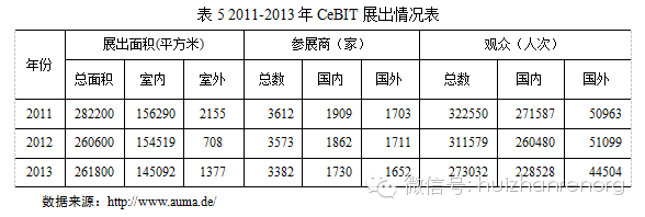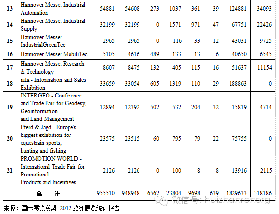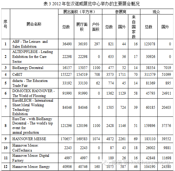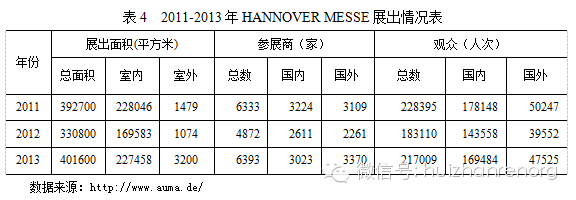 據(jù)國際展覽聯(lián)盟(UFI)統(tǒng)計,2012年漢諾威舉辦的21個主要展覽會總展出面積達(dá)95.5萬平方米,參展商達(dá)2.4萬家,其中國外參展商近萬家,參觀觀眾總數(shù)達(dá)183萬人,國外觀眾達(dá)32萬人(表3)。