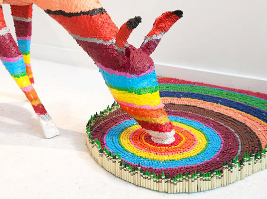 本次“蠟筆達人展”的許多展品由細小的彩色蠟筆制作的雕塑組成,展品造型變化無窮,別出心裁,充滿想象力。蠟筆是兒時常用的繪畫工具,然而極少人知道它不僅可以繪制美麗圖片,更可以用其制作藝術裝置。美國藝術家赫伯·威廉姆斯就是這樣一位蠟筆達人,他以豐富的藝術想象力,將各種顏色的蠟筆在一起組裝,創(chuàng)作出奇趣的蠟筆雕塑世界。