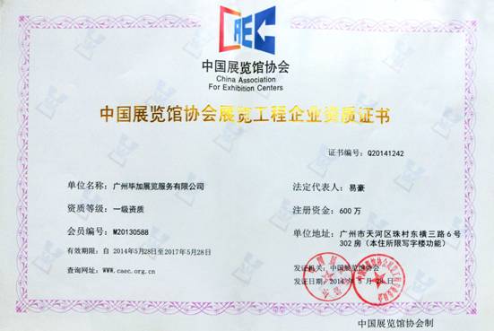 為了適應中國展覽業(yè)快速發(fā)展的形勢,應對國際展覽業(yè)的競爭與合作,進一步規(guī)范市場,提高展覽工程的技術和施工水平,確保展覽工程的質(zhì)量和安全,推動行業(yè)進步與繁榮,中國展覽館協(xié)會特制定展覽工程企業(yè)暨展覽場館工程部門資質(zhì)等級。經(jīng)過層層的審批畢加展覽榮獲“中國展覽館協(xié)會一級資質(zhì)”的最高等級榮譽。