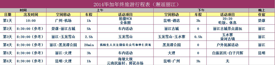 畢加2014年云南秋季旅行行程表: