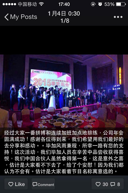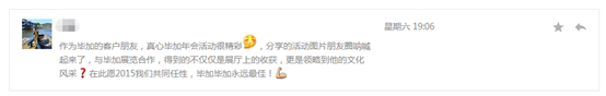 2014畢加展覽年會暨2015聯(lián)歡晚會雖然結束了,但是朋友圈依然熱火朝天,院校、供應商、工廠等朋友們都給了畢加“10086”個贊,紛紛給畢加人發(fā)來賀電,給畢加公司送來祝福。畢加人在年會上精彩的表現(xiàn)讓人眼前一亮,作為一家展覽行業(yè)的標桿企業(yè),來年的我們一定會以實際行動履行我們的承諾,給予客戶更好的設計與服務。這次年會,在畢加角度上講,這就像一個強力馬達,不斷驅動著我們往目標前進。柏拉圖說:漫無目的的生活就像出海航行而沒有指南針。航海沒有指南針,就是一艘船在海上航行,沒方向,那有可能遇上大風浪,暴雨,暗礁,隨時沉沒死亡。一條條的評價聚集在一起,讓畢加展覽這艘豪輪有了一個風向標,始終瞧著目標前進。