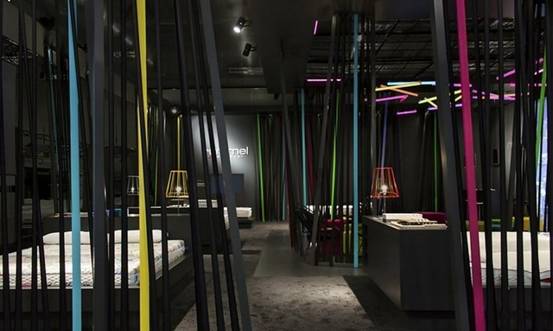 光的強(qiáng)弱對(duì)人的情緒影響是不同的,展示臥房家具時(shí)宜采用柔和光,讓人覺得溫馨安寧;展示客廳家具時(shí),多采用明亮光,給人舒適愉快感。展示不同材質(zhì)的家具宜選用相應(yīng)色溫的光源,一般來說,玻璃、金屬、石材家具宜選用高光色(冷感),以體現(xiàn)質(zhì)堅(jiān)的特性;而木質(zhì)、布藝家具用低光色(暖感)的光源照射更能增強(qiáng)柔和感。