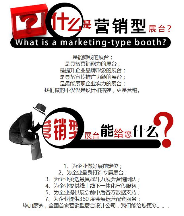 如果您覺(jué)得您的參展效果一直不理想,請(qǐng)找畢加展覽,營(yíng)銷(xiāo)型展臺(tái)會(huì)幫你獲得以往2-3倍的參展效果。營(yíng)銷(xiāo)型展臺(tái)是指以現(xiàn)代營(yíng)銷(xiāo)理念為核心,基于企業(yè)營(yíng)銷(xiāo)目標(biāo)進(jìn)行規(guī)劃,具有良好、完備的效果評(píng)估體系,能夠提供一系列的服務(wù),為客戶(hù)提高產(chǎn)品銷(xiāo)售業(yè)績(jī)和品牌知名度的營(yíng)銷(xiāo)方案。
