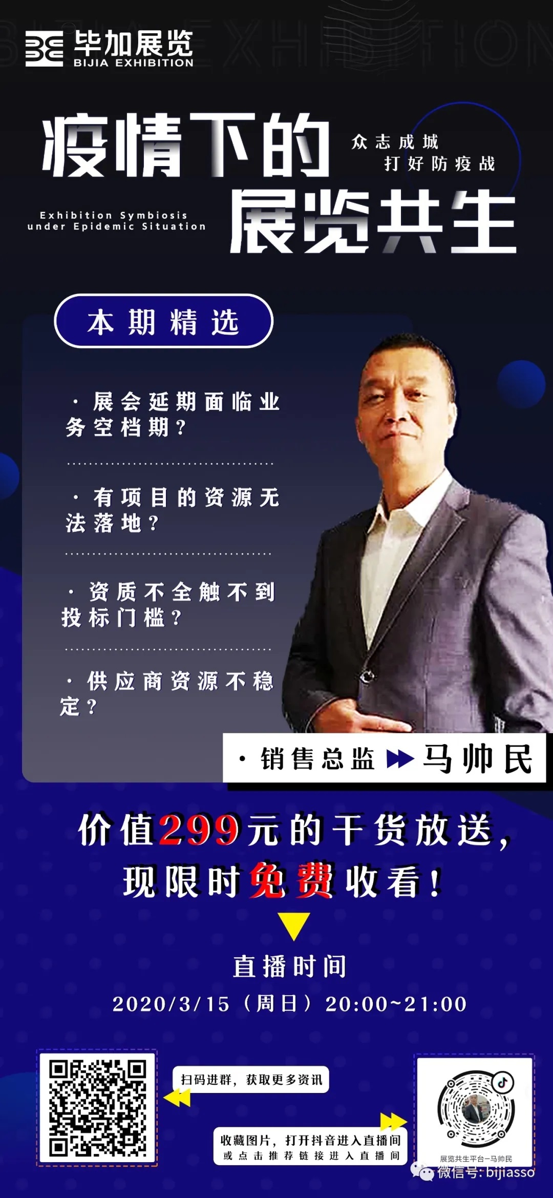 時(shí)間將于2020年3月15日(周日)晚上8點(diǎn)到9點(diǎn),在抖音平臺為大家直播講解行業(yè)問題,歡迎各位展覽行業(yè)的老板共同參觀。