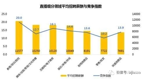 智聯(lián)招聘發(fā)布的《2020年春季直播產(chǎn)業(yè)人才報告》顯示,疫情下直播行業(yè)招聘需求同比逆勢上漲1.3倍,平均招聘薪酬9845元/月。負(fù)責(zé)直播界面設(shè)計、開發(fā)、測試、運維等多階段把控的直播產(chǎn)品開發(fā)崗位以26076元/月的高薪位居薪酬第一;與教育行業(yè)直播崗位的高薪相呼應(yīng),直播教師的平均薪資達(dá)到11577元/月;作為招聘需求最高的“門面”,視頻主播/藝人的薪資為10188元/月。