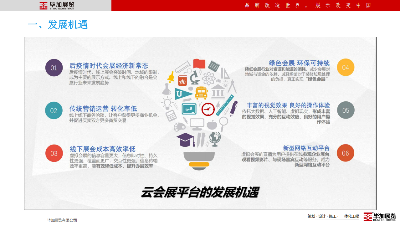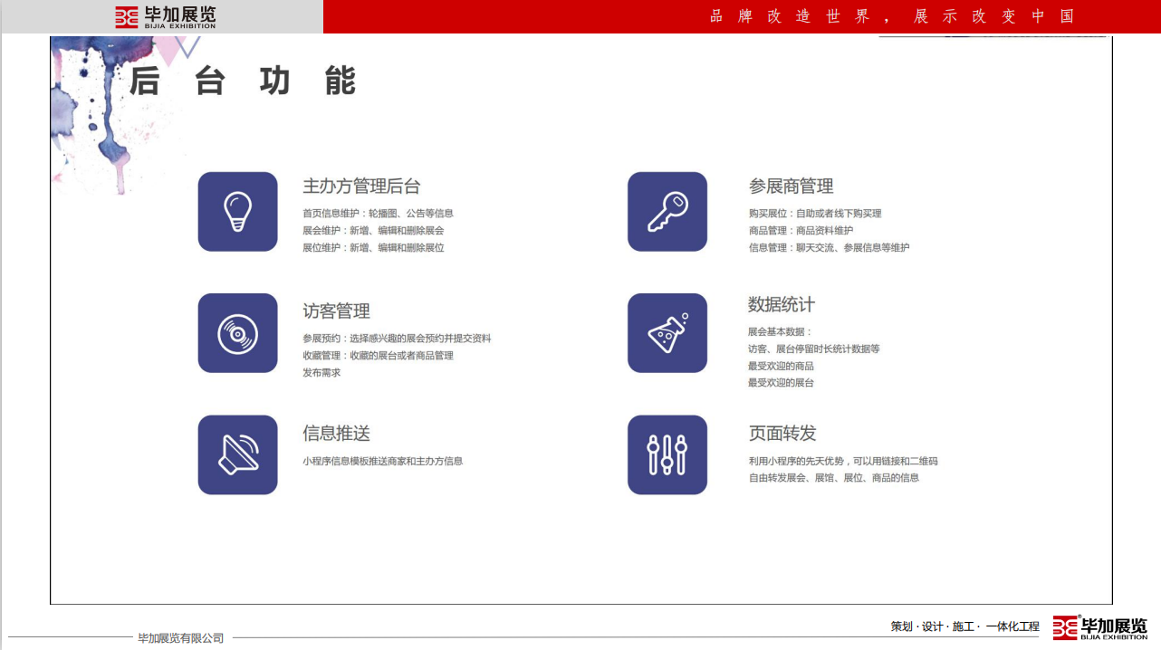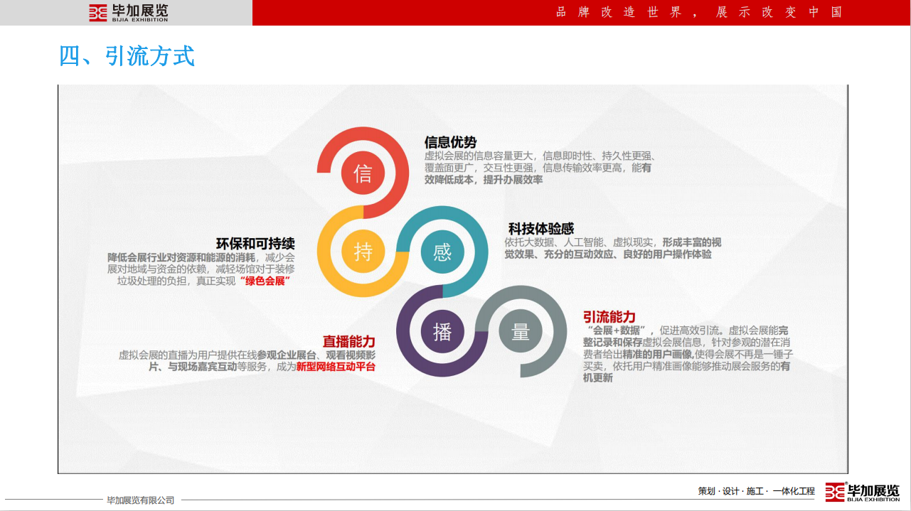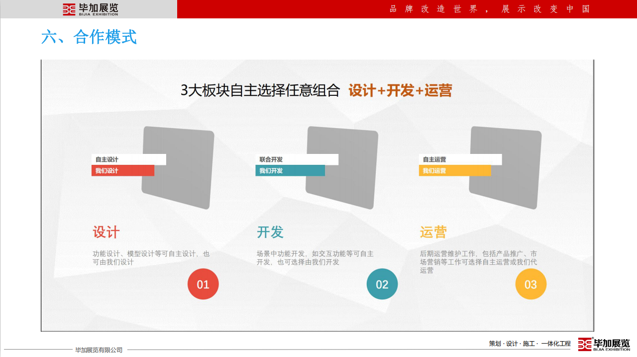 畢加展覽有限公司成立于2008年,注冊資金2000萬。12年專注于展廳博物館設計施工、展臺設計搭建、主場活動運營策劃、展具專柜定制等專業(yè)服務,獲得了中國展覽館工程一級、建筑裝飾總承包貳級,設計乙級等資質(zhì),是央視CCTV受邀專訪企業(yè),參與起草了中國國際促貿(mào)會《展覽會展臺術語》團體標準,并于2019年7月1日全國實施。畢加展覽在國內(nèi)外設有24個分子公司及辦事處,擁有100000㎡產(chǎn)業(yè)園和制作工廠,是一家展示營銷設計施工一體化的專業(yè)服務企業(yè)。畢加以十二年展示營銷領域成長的深厚基礎,以企業(yè)成長發(fā)展必須的營銷和管理能力為支撐,為所有共生合伙人賦能,齊力筑造共生合伙平臺,創(chuàng)造共贏經(jīng)濟生態(tài)圈。
