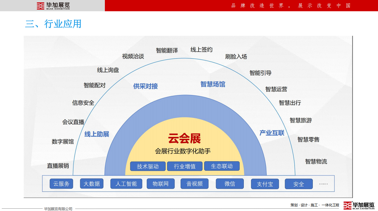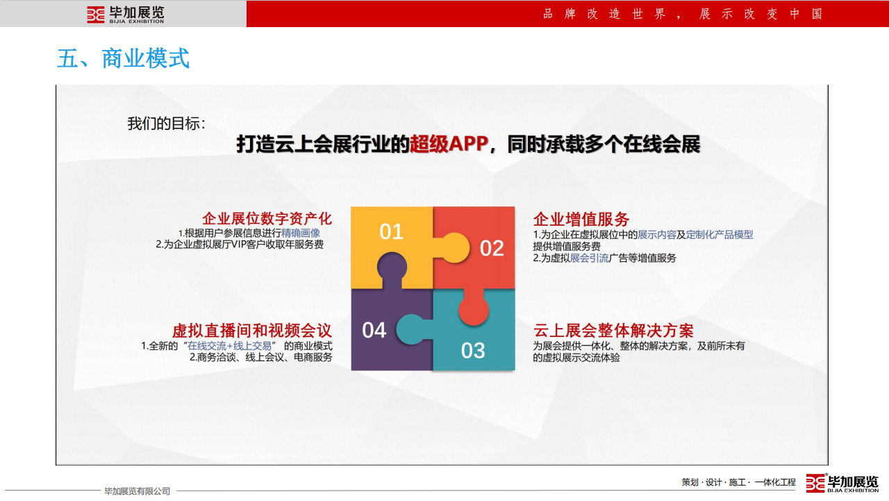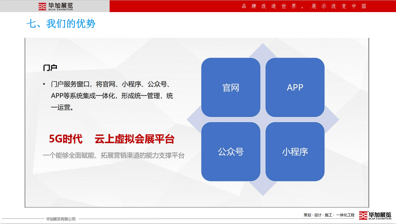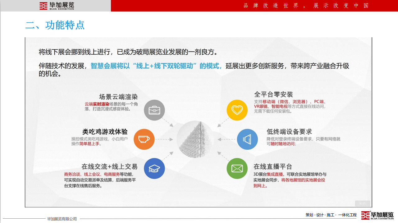 畢加展覽有限公司成立于2008年,注冊資金2000萬。12年專注于展廳博物館設計施工、展臺設計搭建、主場活動運營策劃、展具專柜定制等專業(yè)服務,獲得了中國展覽館工程一級、建筑裝飾總承包貳級,設計乙級等資質(zhì),是央視CCTV受邀專訪企業(yè),參與起草了中國國際促貿(mào)會《展覽會展臺術語》團體標準,并于2019年7月1日全國實施。畢加展覽在國內(nèi)外設有24個分子公司及辦事處,擁有100000㎡產(chǎn)業(yè)園和制作工廠,是一家展示營銷設計施工一體化的專業(yè)服務企業(yè)。畢加以十二年展示營銷領域成長的深厚基礎,以企業(yè)成長發(fā)展必須的營銷和管理能力為支撐,為所有共生合伙人賦能,齊力筑造共生合伙平臺,創(chuàng)造共贏經(jīng)濟生態(tài)圈。