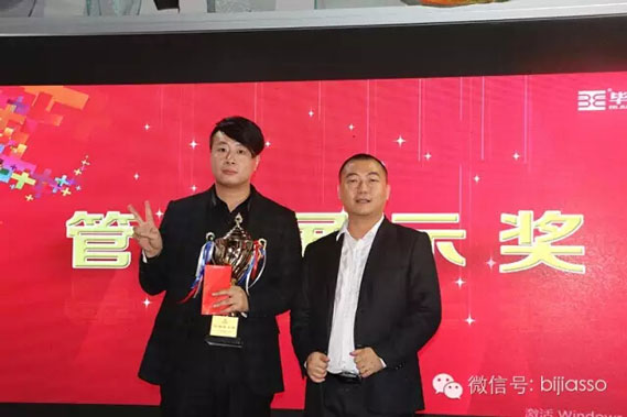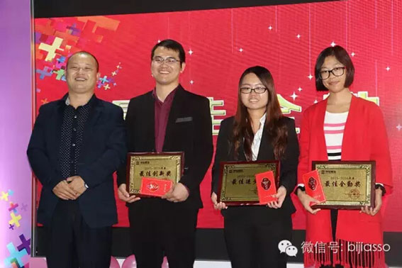 不要著急,還有三個最佳獎項,榮獲2015年度最佳創(chuàng)新獎的是加索工廠總經理王春才,王廠在型材以及新型材料的應用摸索上,放眼全公司,亦或是戴總易總,他們都沒有這方面的經驗,所以王廠無論實在推廣型材創(chuàng)新,新型材料的發(fā)展及應用上面都是第一人,創(chuàng)造了很多新的運用方法和技巧。型材必定是展覽行業(yè)的趨勢,在王廠的悉心經營下,越來越多展商找到了我們要求進行型材搭建;
