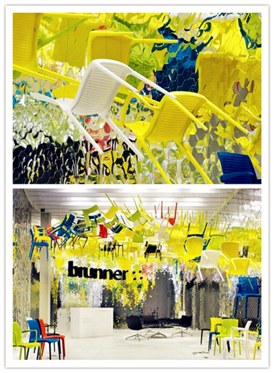 本次展位設(shè)計(jì)的核心是最新產(chǎn)品系列“twin”。在這一展位上,家具不再是簡(jiǎn)單的展品,而是成為情景中具有主動(dòng)性的一份子,讓人聯(lián)想到裝置藝術(shù)作品。放眼望去,整個(gè)展臺(tái)的亮點(diǎn)設(shè)計(jì)由幾十把吊在觀者頭頂上的椅子組成??臻g全部使用聚苯乙烯鏡面包裹,鏡面的反射使堆積的椅子效果更加強(qiáng)烈。鏡面的蜂窩形態(tài)打碎了反射的影像。訪客看到的不再是一個(gè)個(gè)單一的形態(tài),而是一幅交融的像素色彩拼盤(pán)。