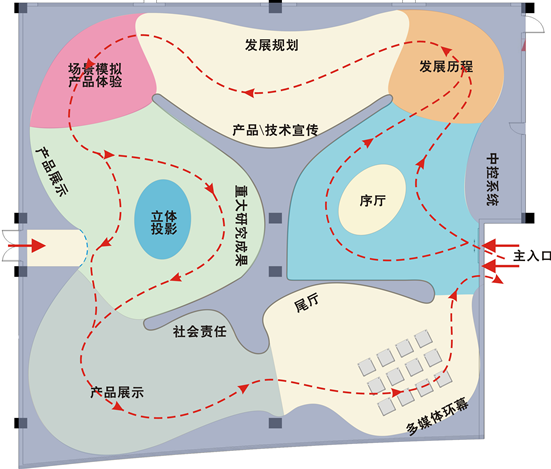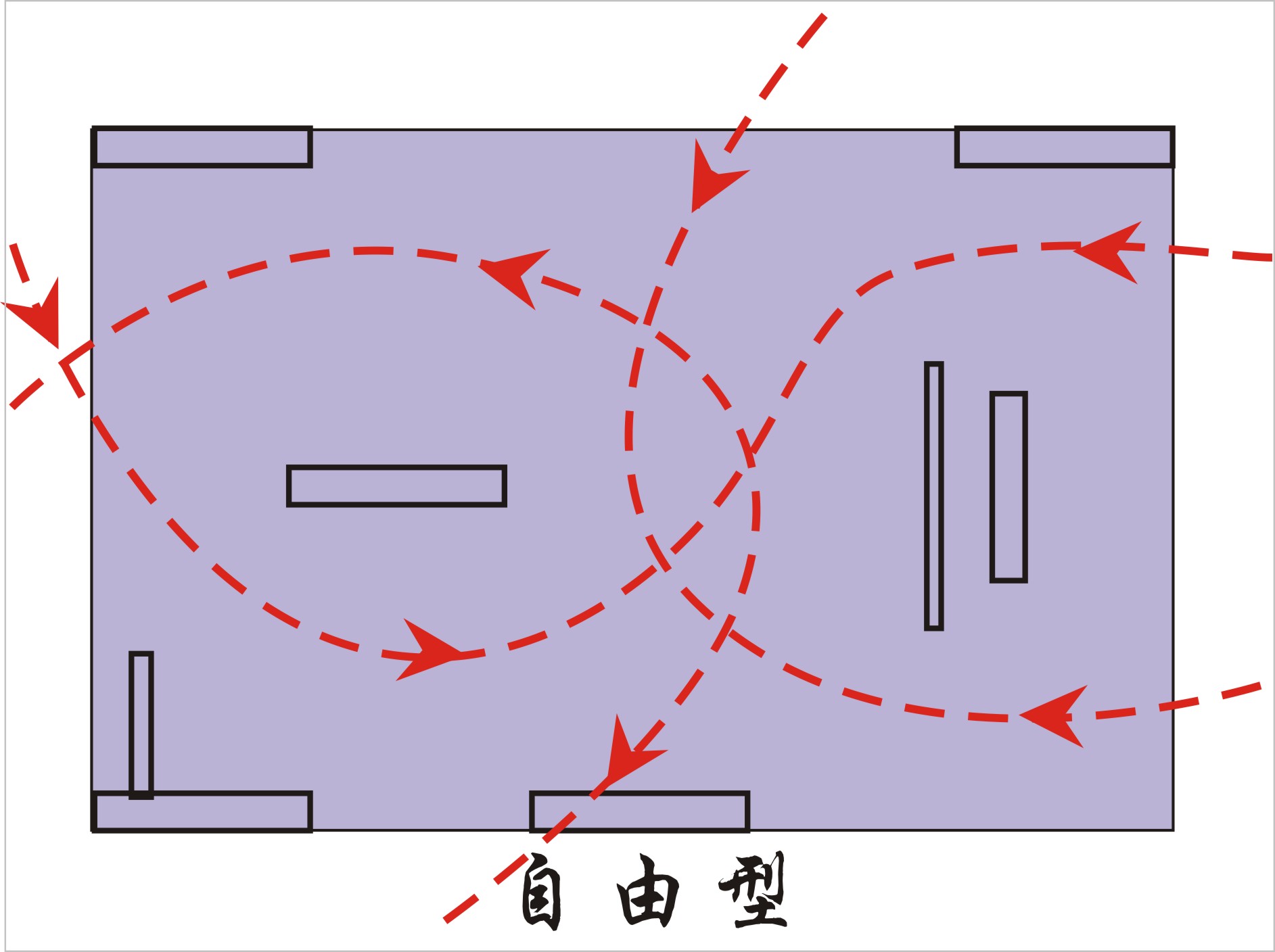 3、自由路線:當(dāng)室內(nèi)空間較大時(shí),可以通過入口、宣傳單制作等方式向人流提供參考線路,而具體的流動(dòng)線路由人流自由選擇,根據(jù)自己的興趣愛好在規(guī)定范圍內(nèi)自由參觀,如果僅規(guī)定出入口設(shè)置導(dǎo)向板引導(dǎo)方向,對(duì)觀眾參觀行走路線加以干涉,不考慮觀眾的興趣,使其處處受到制約,那時(shí)不尊重觀眾,同時(shí)也會(huì)降低觀眾的觀賞興趣。