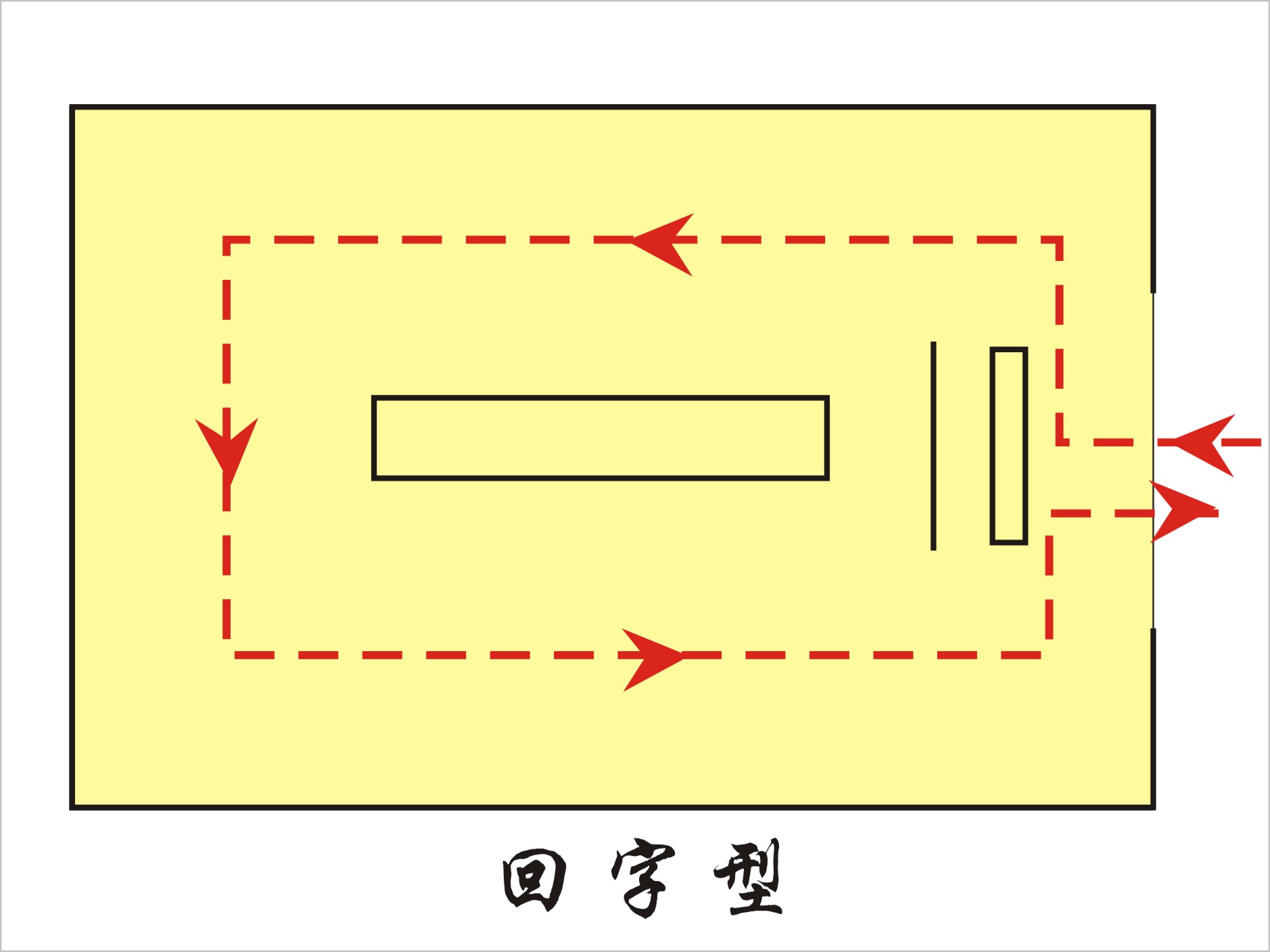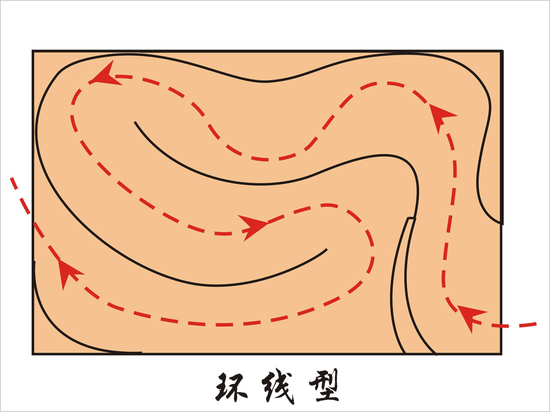 2、環(huán)線路線:在一些三面圍合的空間中入口和出口在同一側(cè)。人流進(jìn)入空間場(chǎng)所之后,經(jīng)過環(huán)線流動(dòng)又從同一側(cè)的出口離開,環(huán)線流動(dòng)的空間場(chǎng)所比較復(fù)雜,理想的人流路線,要能使人流按順序看遍所有物體,將人流視點(diǎn)集中于暢銷區(qū),盡可能避免人流相對(duì)或重復(fù)穿行。