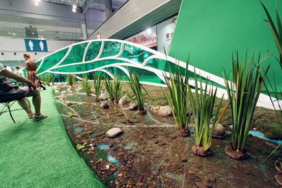 綠色景觀空間和展臺空間一樣都有容積空間、立體空間以及兩者相合的混合空間。容積空間的基本形式是圍合,空間為靜態(tài)的、向心的、內(nèi)聚的,在這樣的空間里面,我們在角落處營造綠色景觀可以很好的突出墻和地,給展品信息的傳遞提供了很好的輔助作用,在這里的綠色景觀應(yīng)該做到少而精,否則會起到相反的效果。立體空間的基本形式是填充,在這樣的空間里面選中中心地帶植入綠色景觀可以豐富空間層次,給觀眾一種流動和散漫之感,給展示空間增添無限魅力,這時候注意到植物的高低搭配會使展示效果更上一層樓。